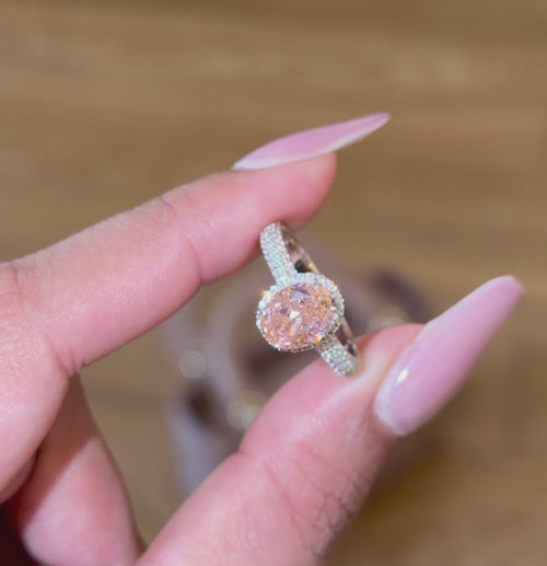 Design: Oval-cut pink centre with halo and pavé band symbolizing romance, softness, and eternal elegance.